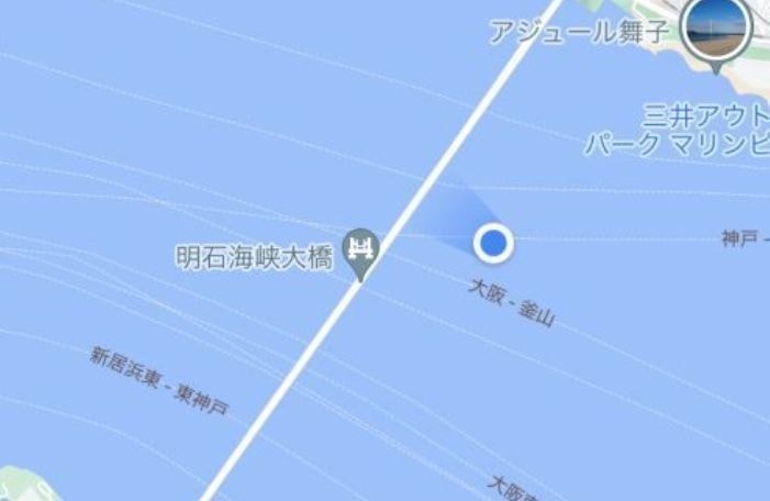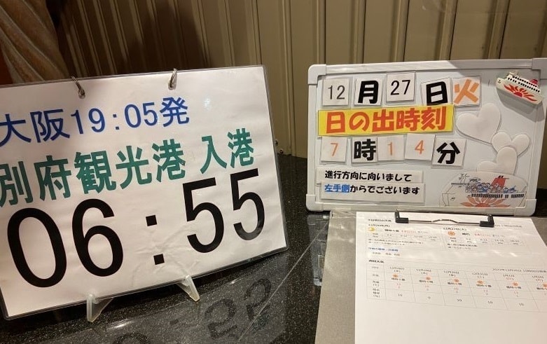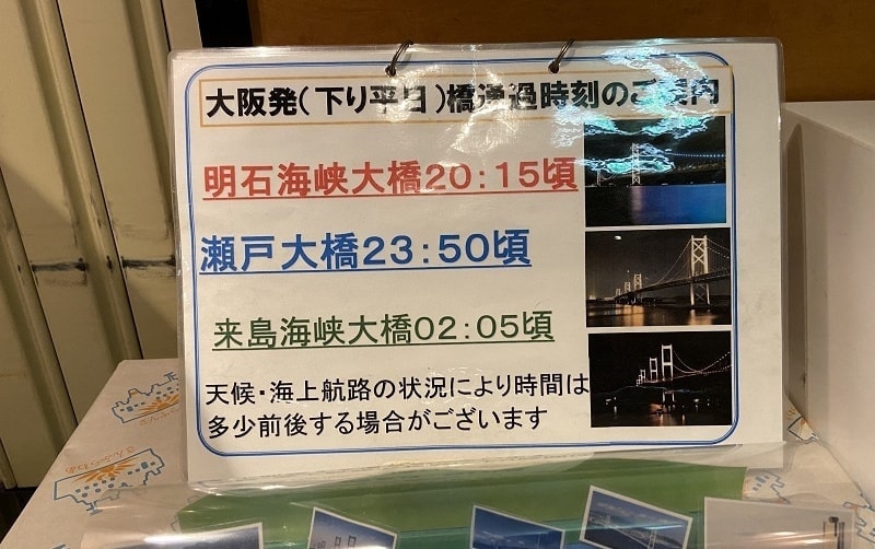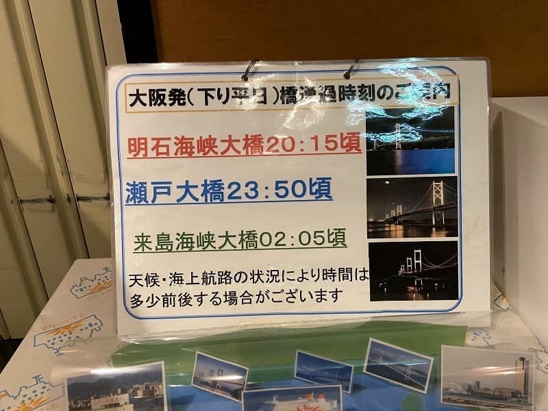 船内では大浴場も楽しみしにていましたので、風呂上がりにパブリックスペース(展望デッキ)で飲むビールは最高でした。もちろん貧乏旅行ですので夕食のお弁当やビール、つまみは南港近くのスーパーで調達しています。こちらで船が著名な橋をくぐる予定時間がわかります。