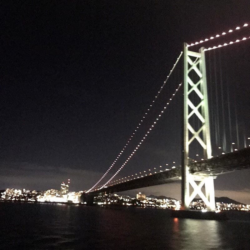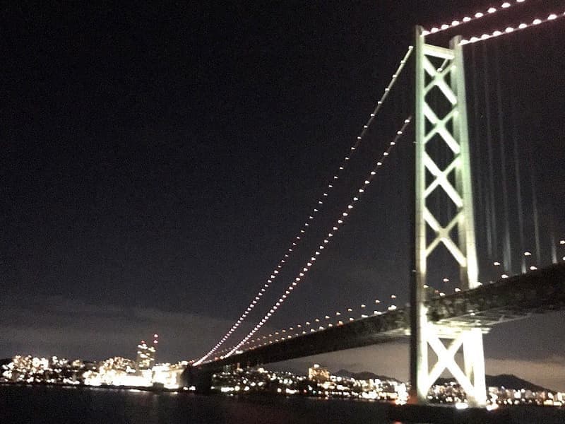 夜の出港、朝の入港ですから、夜の瀬戸内海や夜景は明石大橋まであたりでした(走ってもくぐっても素晴らしい橋です)。
