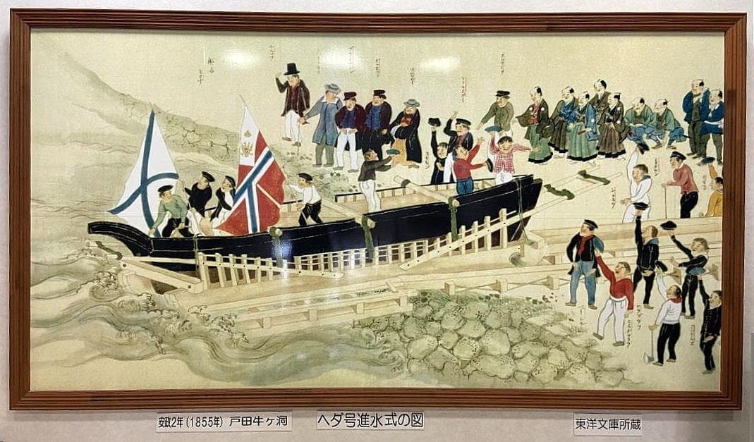 しかし安政の大地震に見舞われディアナ号が破損。修復へと戸田に向かうも結局ディアナ号は沈没。そのディアナ号の代船として日本の船大工が結集しロシア人と共にわずか3か月ほどで、日本初の洋式帆船「ヘダ号」を作り、このことが日本のその後の近代造船の始まりになったといいます。