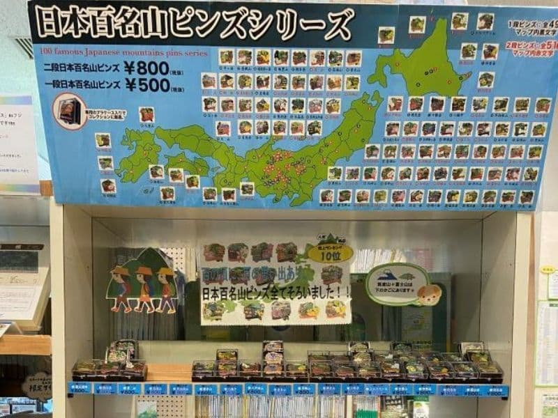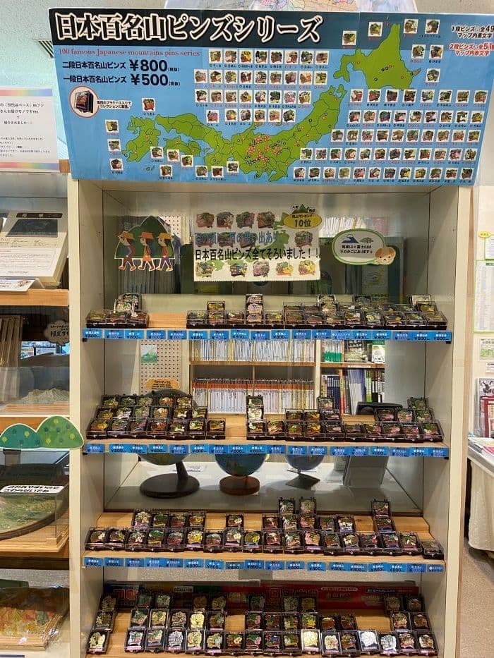 【左写真】売店には日本百名山のピンバッチすべてが販売されています。