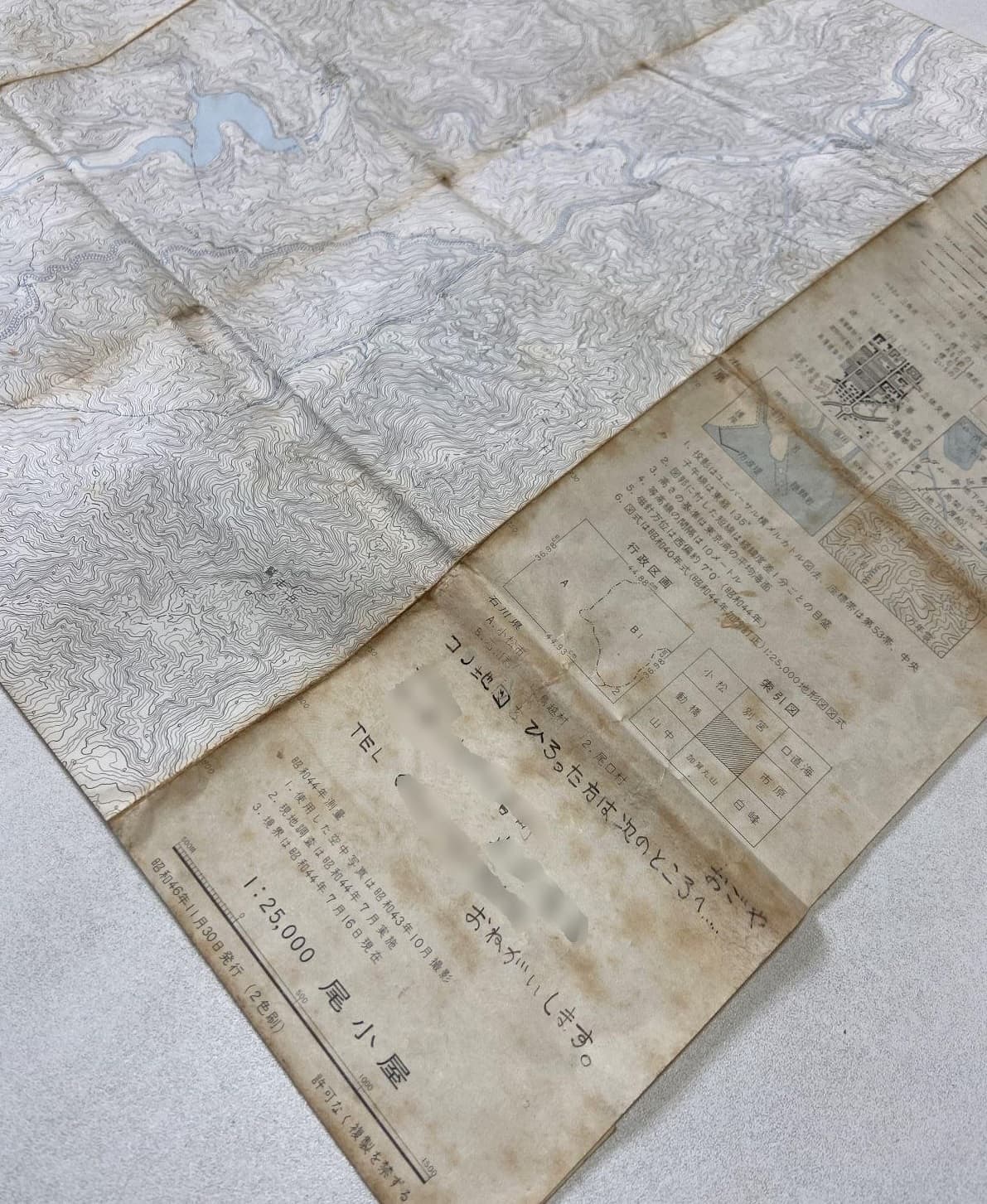 【右写真】中学生の時に使っていた2万5千分の1地形図(昭和46年、1971年11月発行の2色刷り)。