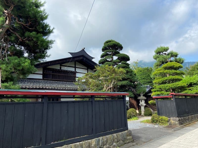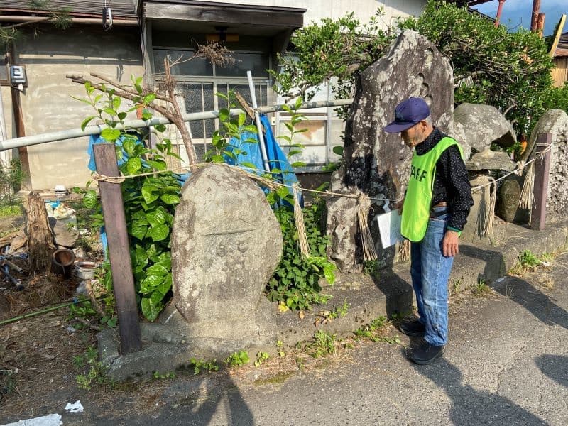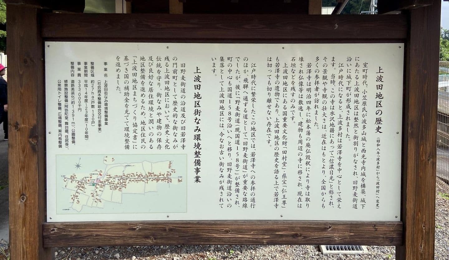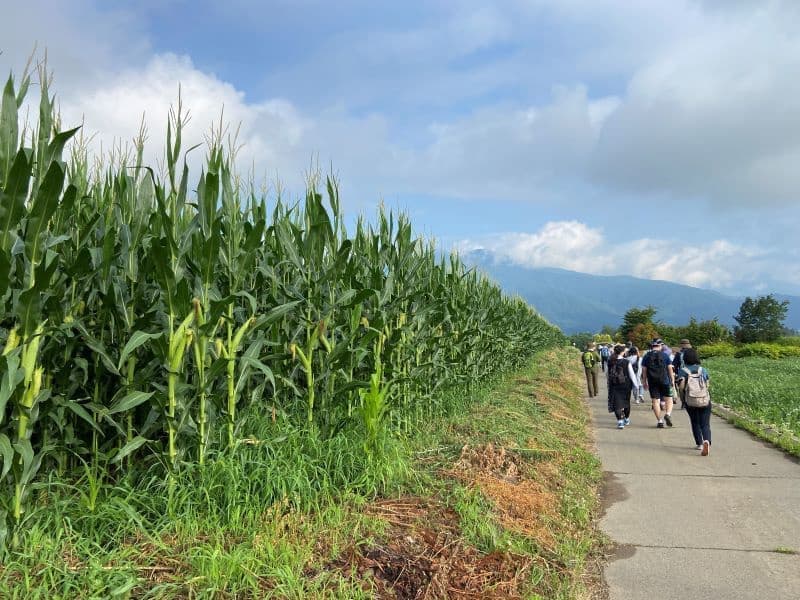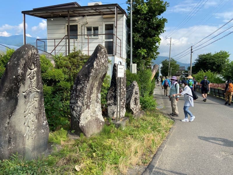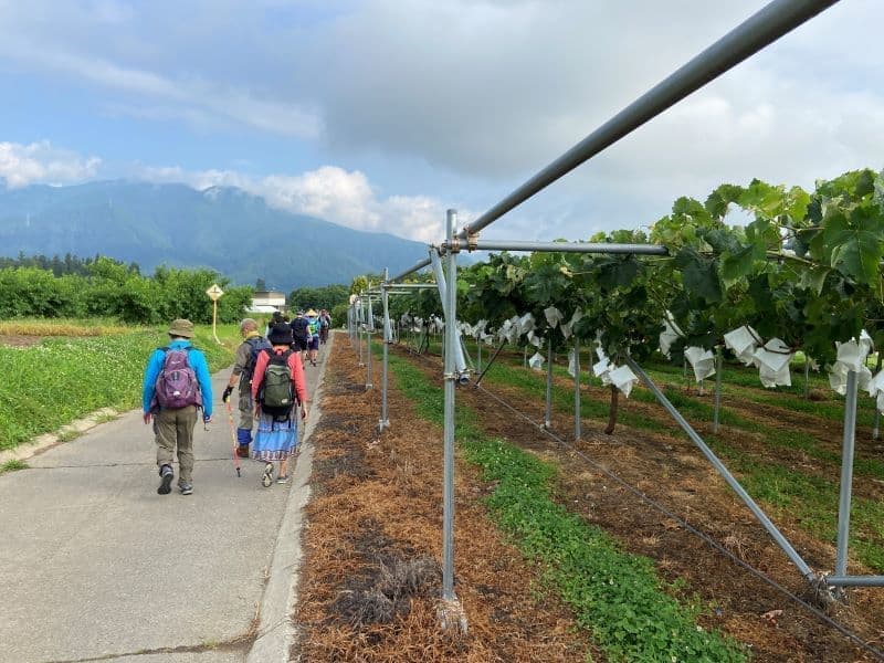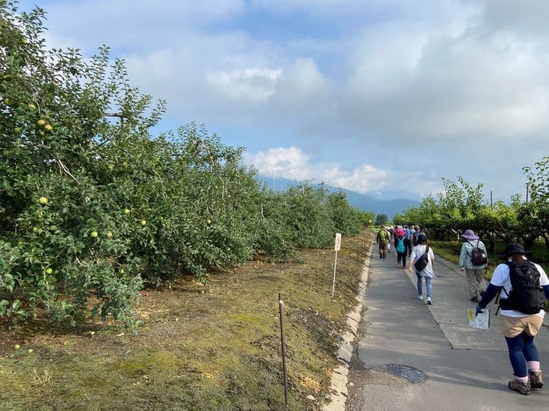 野麦街道コース(6.6km)と若澤寺コース(8.8km)が選べますが後者を選択。まずは果物畑を進み、やがて波田の町中に。同行のガイドさんから道祖神や石碑、神社仏閣について丁寧な説明をいただきます。