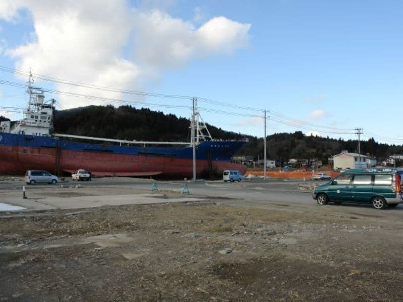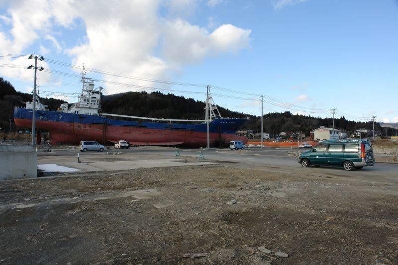 (下左写真)気仙沼市の市街地に打ち上げられた大型漁船「第18共徳丸」は2013年に解体されました。