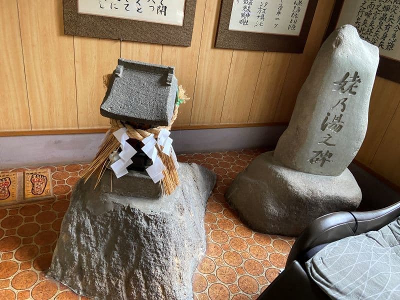 駐車場から本館受付に向かう通路脇になんと!「尾小屋鉱山銅製錬鍰(からみ)」なる六角柱の短い柱のようなものが並べられていました。