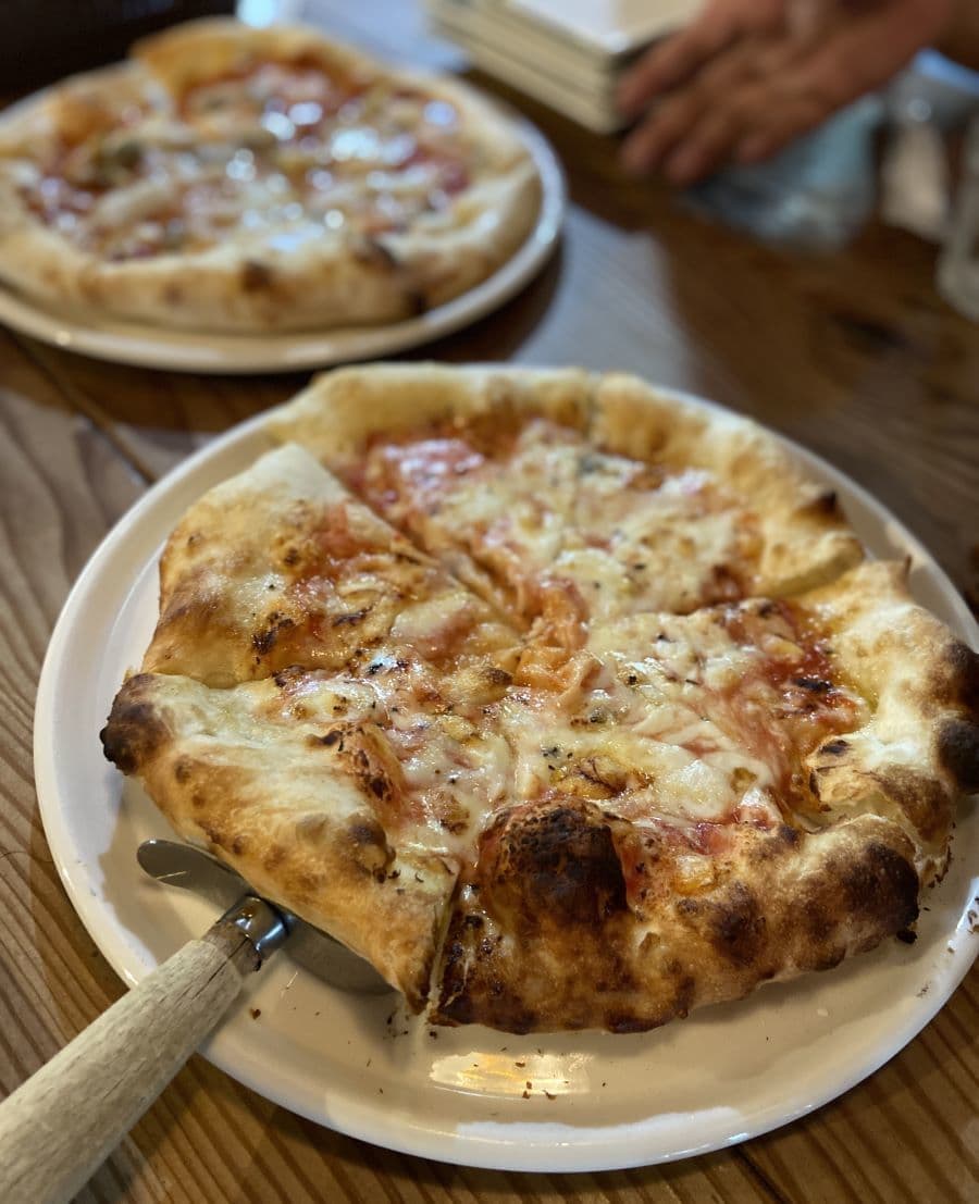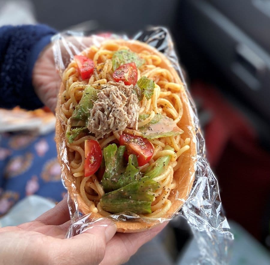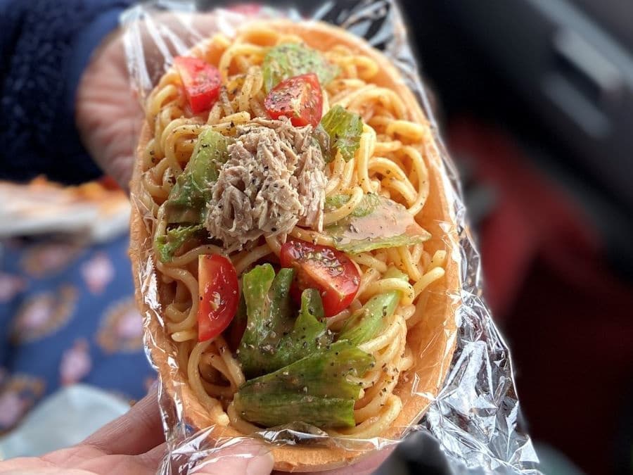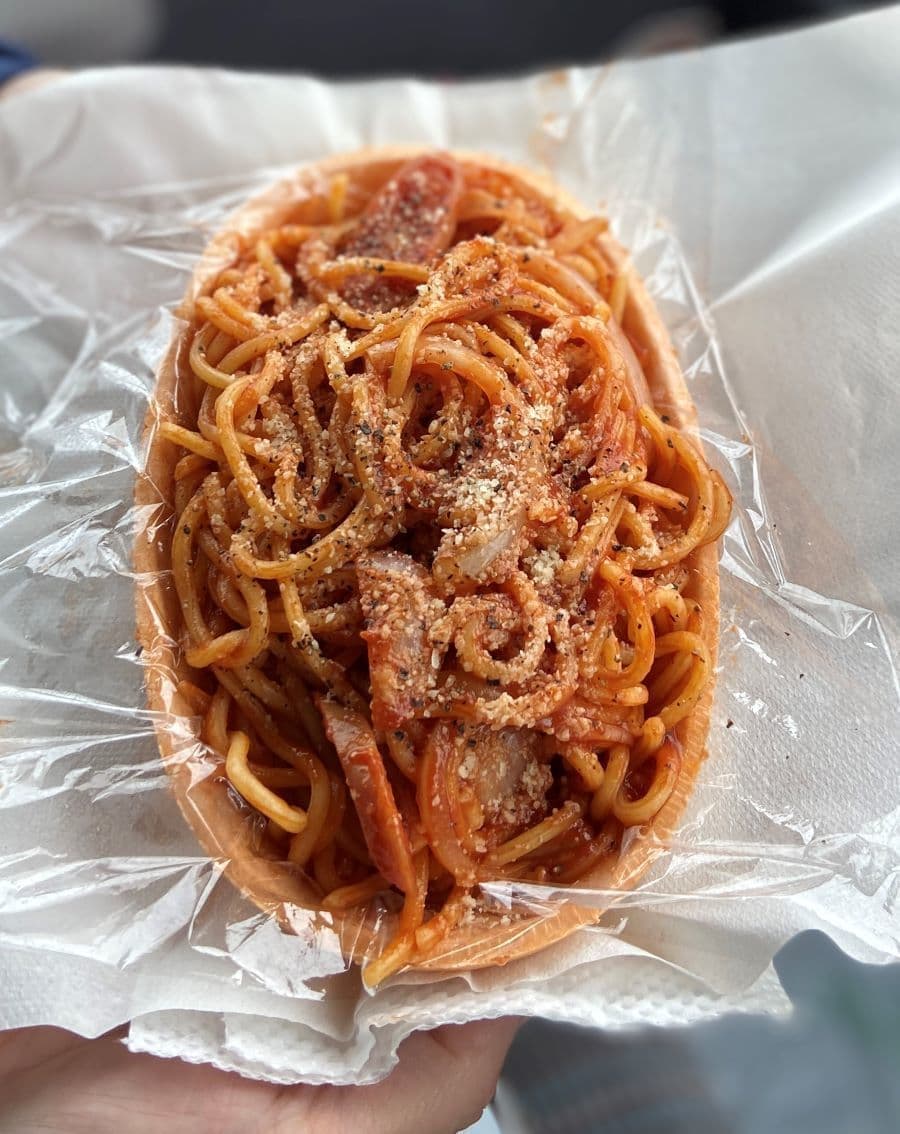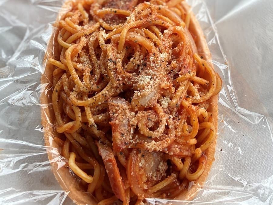 ナポリタンには、地元のブランド豚「杜仲豚」を使ったソーセージも。食べられる器はえびせんの味がしました。