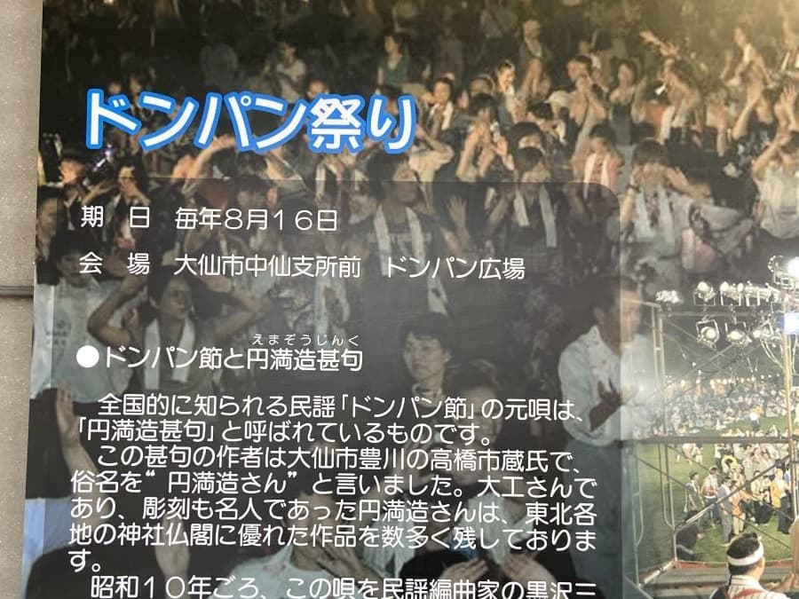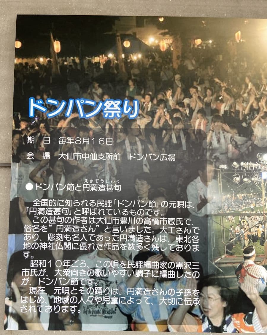 なお、道の駅なかせんのある大仙市は秋田県の代表的民謡「ドンパン節」の郷として知られ、毎年8月16日にはドンパン祭りが開催されています。