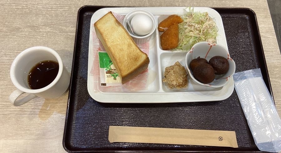 さて7時きっかり、初のモーニングを求めて(和食と洋食のうち多くは和食を選んでいました)席に着きます。厚さ5センチはあろうトースト、名物のイカフライのレモン煮(西尾市内の学校給食にもあるそうです)、果物はライチ、そして茹でたまごに、唐揚げ。コーヒーのおかわり自由もありがたいですね。