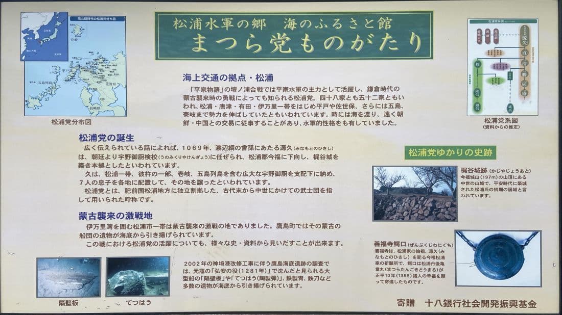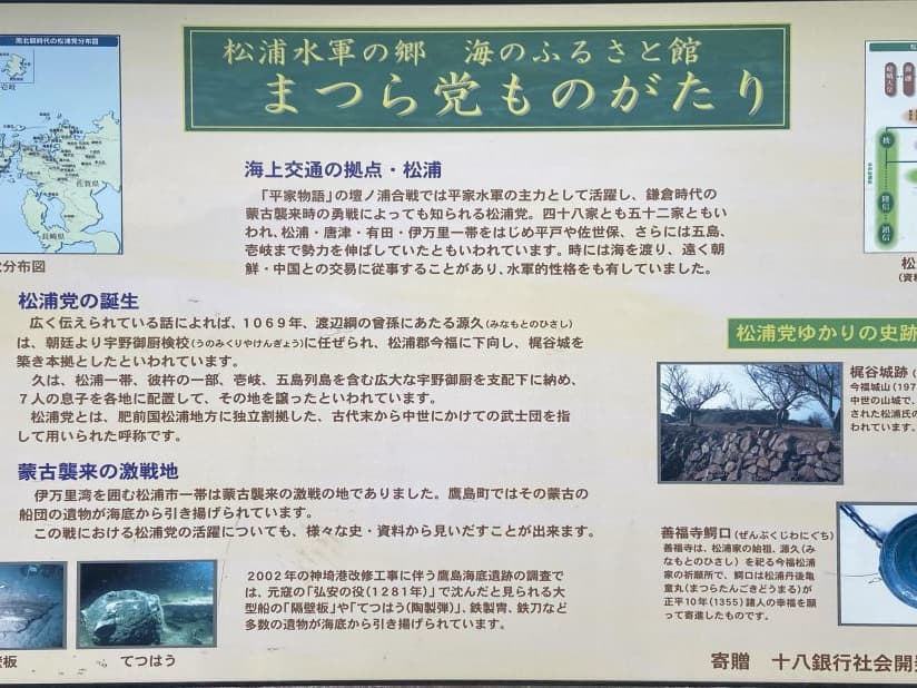 小生の旅のテーマの一つに水軍(海賊、松浦水軍は村上水軍、九鬼水軍と並ぶ三大水軍の一つとも言われます)ゆかりの地を訪ねるという楽しみがありますが、ここ松浦は蒙古襲来時に元寇と戦った松浦党(水軍)の拠点であります。