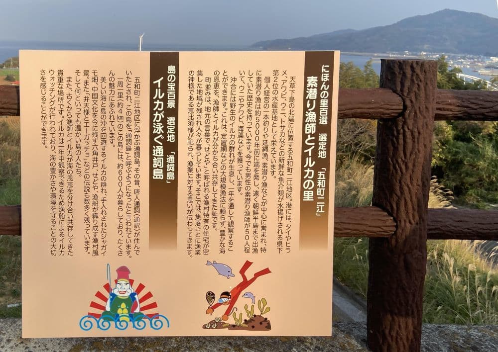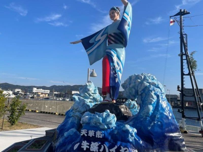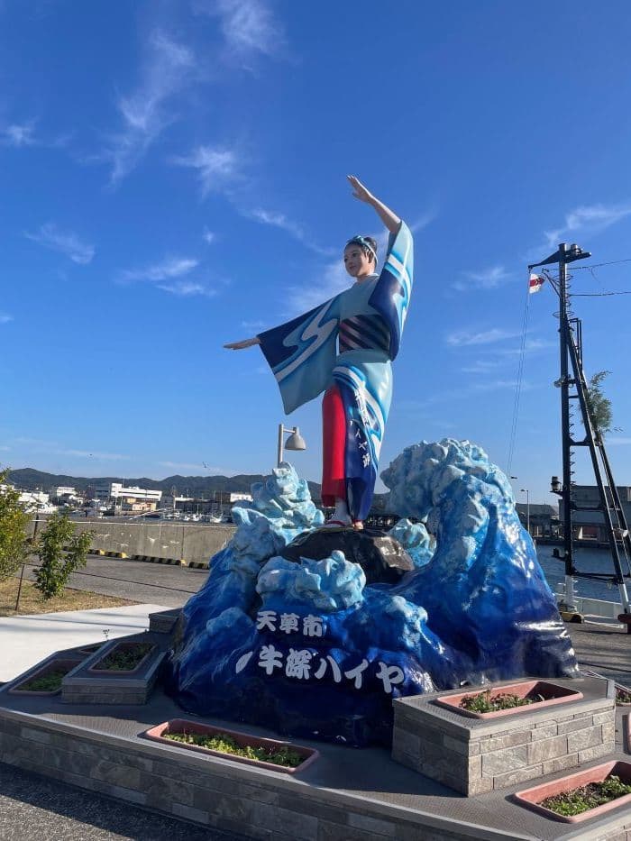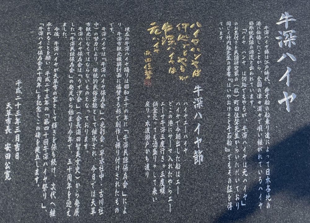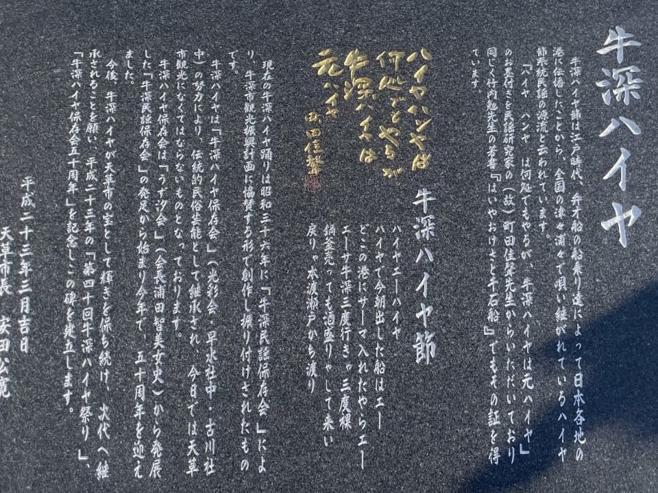 出港の牛深には伝統芸能「牛深ハイヤ節」のモニュメントがありました。