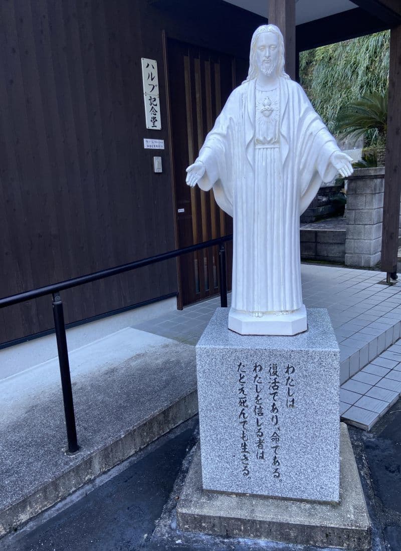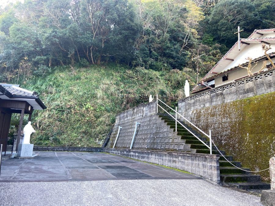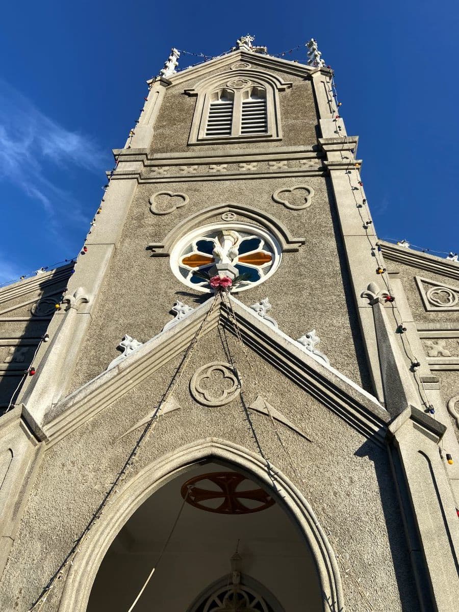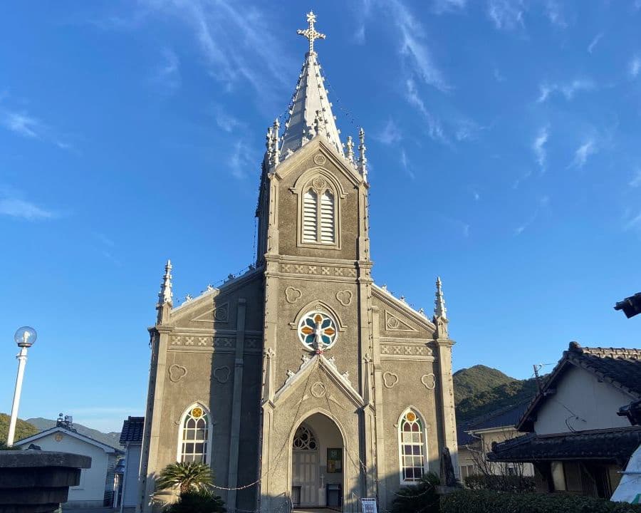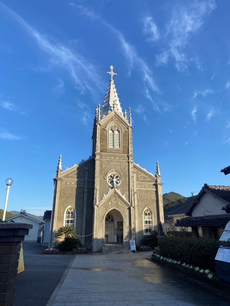「海の天主堂」といわれる現在の教会は1934年再建とあります(旧庄屋の敷地にあり、明治6年まで絵踏みがなされていた場所)。正面の尖塔部分は鉄筋コンクリートですが後面は木造、内部は畳敷き(朝一番のため公開前でした)だそうです。